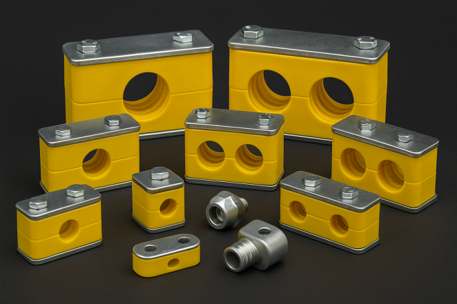 Hidrolik sistemlerde, endüstriyel tesislerde, inşaat makinelerinde ve gemi sanayisinde boru ve hortum hatlarının sabitlenmesi için kullanılır. Tekli, çiftli ve özel ölçülü kelepçe çeşitleriyle, yüksek basınçlı hatlarda titreşimsiz ve güvenli bağlantı çözümleri sunar.